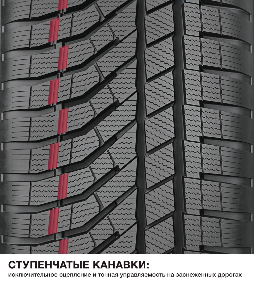 За счет ступенчатого строения канавок шина захватывает большее количество снега, что способствуют лучшему самоочищению протектора. Это повышает сцепление на снегу и улучшает управляемость на мокрых дорогах.