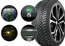 Технология удержания шипов объединяет специальную резиновую смесь с особопрочным составом и концепцию амортизации воздуха, что снижает негативное влияние шипов на дорожное покрытие. А срок службы и эффективность ошиповки обеспечены за счет специальной фиксации в протекторе.