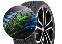 Двойная система ошиповки помогает сохранять контроль независимо от погодных условий и типа покрытий. Шипы расположены под определенным углом и обеспечивают максимальное сцепление на скользкой дороге: при поворотах и маневрировании боковые шипы удерживают автомобиль под контролем.