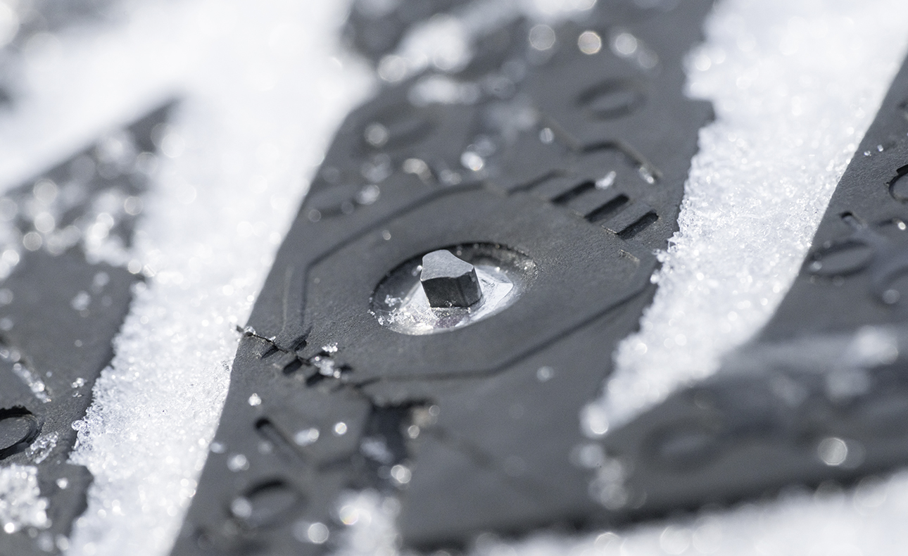 Двойная система ошиповки помогает сохранять контроль независимо от погодных условий и типа покрытий. Шипы расположены под определенным углом и обеспечивают максимальное сцепление на скользкой дороге: при поворотах и маневрировании боковые шипы удерживают автомобиль под контролем.